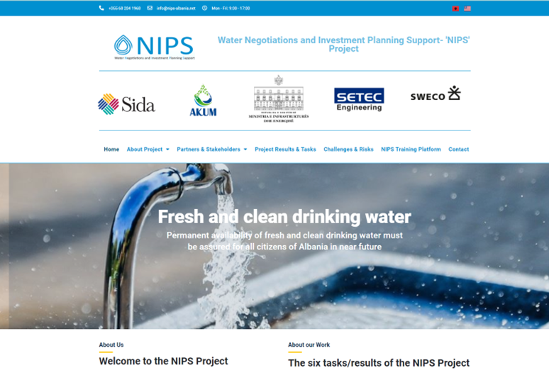The homepage for the project “Water Negotiations and Investment Planning Support” in Albania is now live: nips-albania.net. As reported elsewhere in our “News” section, the project supports Albania's preparations for membership of the European Union by designing implementation plans to achieve compliance with the European Union’s Urban Wastewater Treatment Directive (UWWTD) and Drinking Water Directive (DWD). These directives are key instruments intended to achieve clean, safe drinking water and to assure the well-being of its citizens. These implementation plans are supplemented by a national strategy for the management of sewage sludge, a phased programme of investments and measures aimed at developing institutional capacity for the management of implementation.