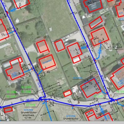 All existing line data (surveying, plans, etc.) are transferred and managed graphically and alphanumerically into the network information system on the basis of the field map. Due to the separate administration on different levels (main line, connection line, house connection, dimensioning, etc.), overview plans, multi-sector plans, hydrant plans, etc. are created from the recorded as-built plans. Digital maps are available in shape format for GIS.
