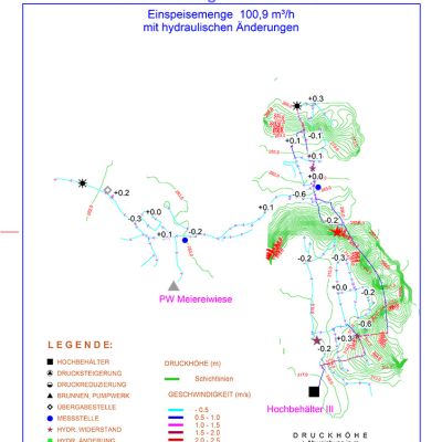 Comparison calculation for the calibration of the hydraulic model: A prerequisite for the reliability of simulation calculations of a calculation model is complete and correct pipe network data. On the basis of the measurement results of the pressure and flow measurement, the calculation model is calibrated by comparing the calculation results with the measurement results (determination of material-specific roughness, proof of the correctness of the important pipe diameters and connections of the pipes. Detection of possible punctual resistances such as accidentally throttled or closed gate valves, functionality of pressure reducing valves in case of load).