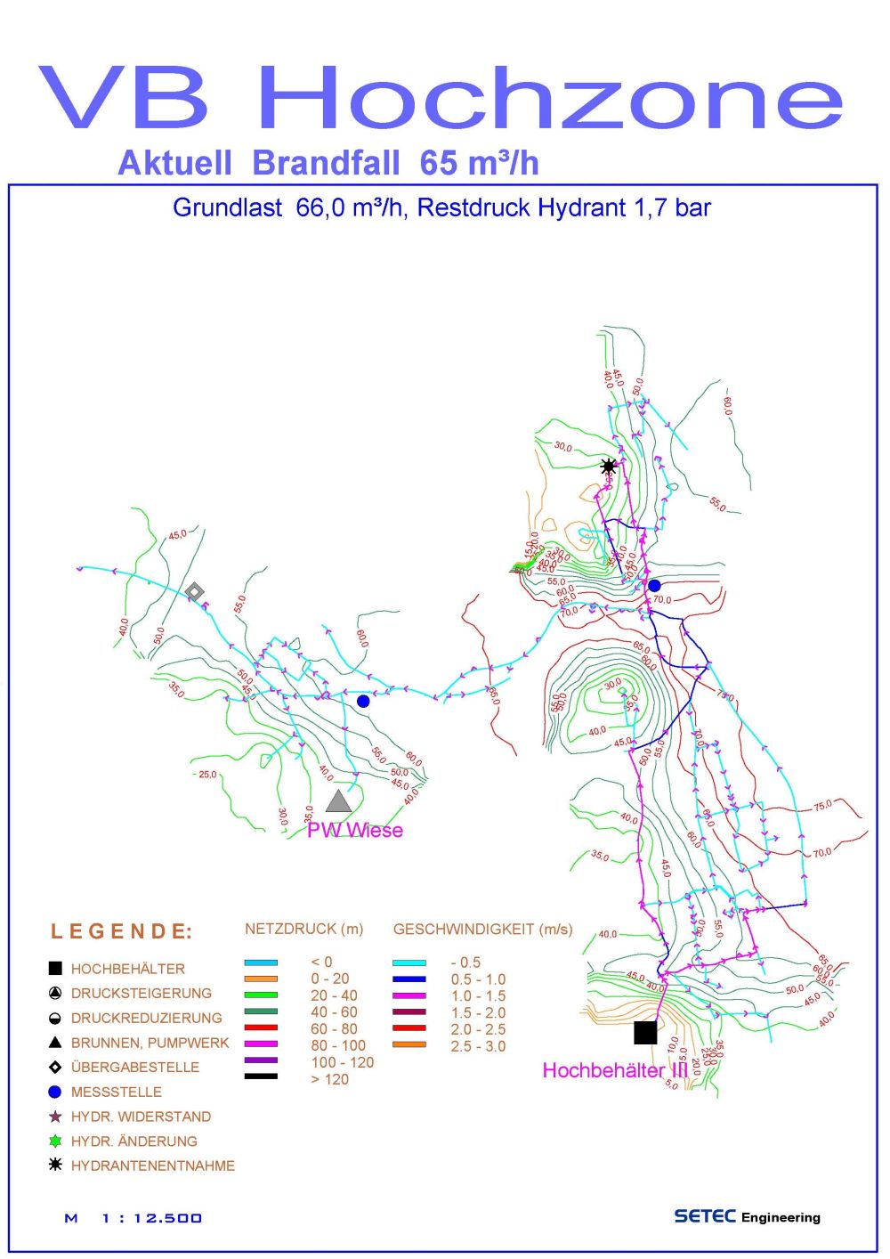 Hydranten Objektschutz Lastfallberechnung: Darstellung mit Summe der Entnahmeleistung bei zeitgleicher Entnahme, frei wählbar aus bis zu 4 Hydranten. Grafik mit Restdruckverhältnissen bei dieser Belastung in der gesamten Zone.