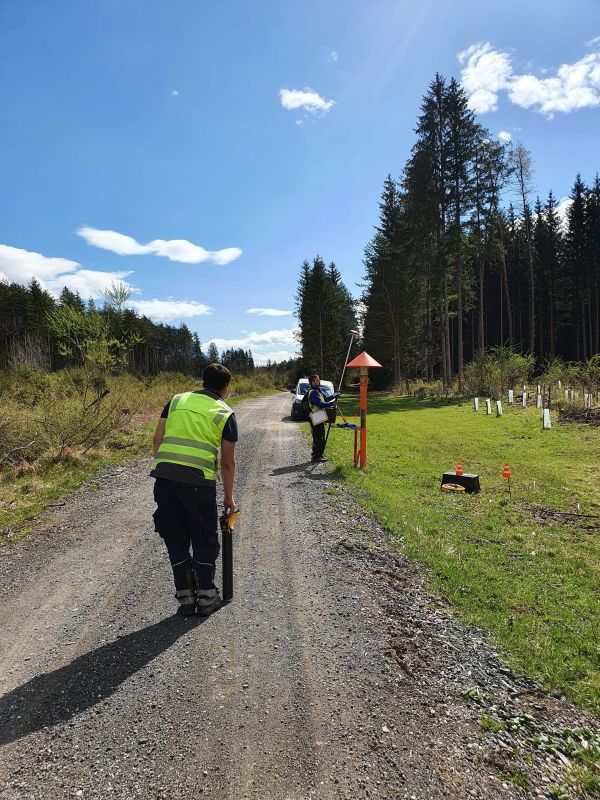 Im Anschluss erfolgt die Lagevermessung der Ortungspunkte mittels GPS-Gerät. Zusätzlich werden alle markanten Punkte wie Strassenquerungen, Böschungen, Gerinne- und Bachquerungen, AWP-Marker, Bachmarkierungssteine- und Stangen aufgenommen.